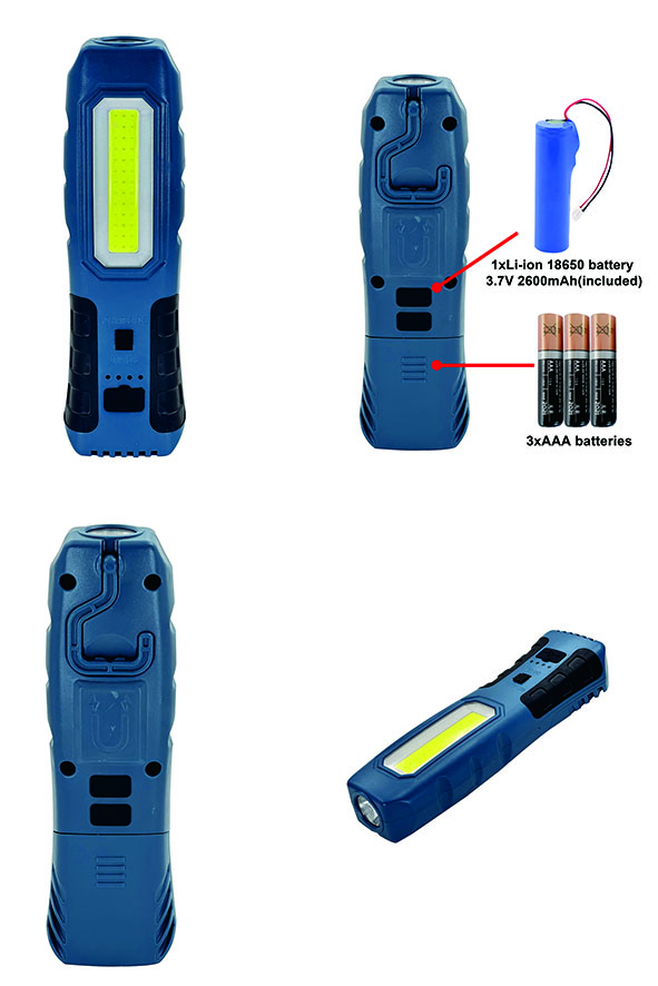 SL-405 1) Compact ABS plastic body 2) Integrated magnet and a hanging hook at the backside 3) Hybrid power, both rechargeable and dry battery can be used 4)1xType-C USB port for charging the light 5)With power indicato